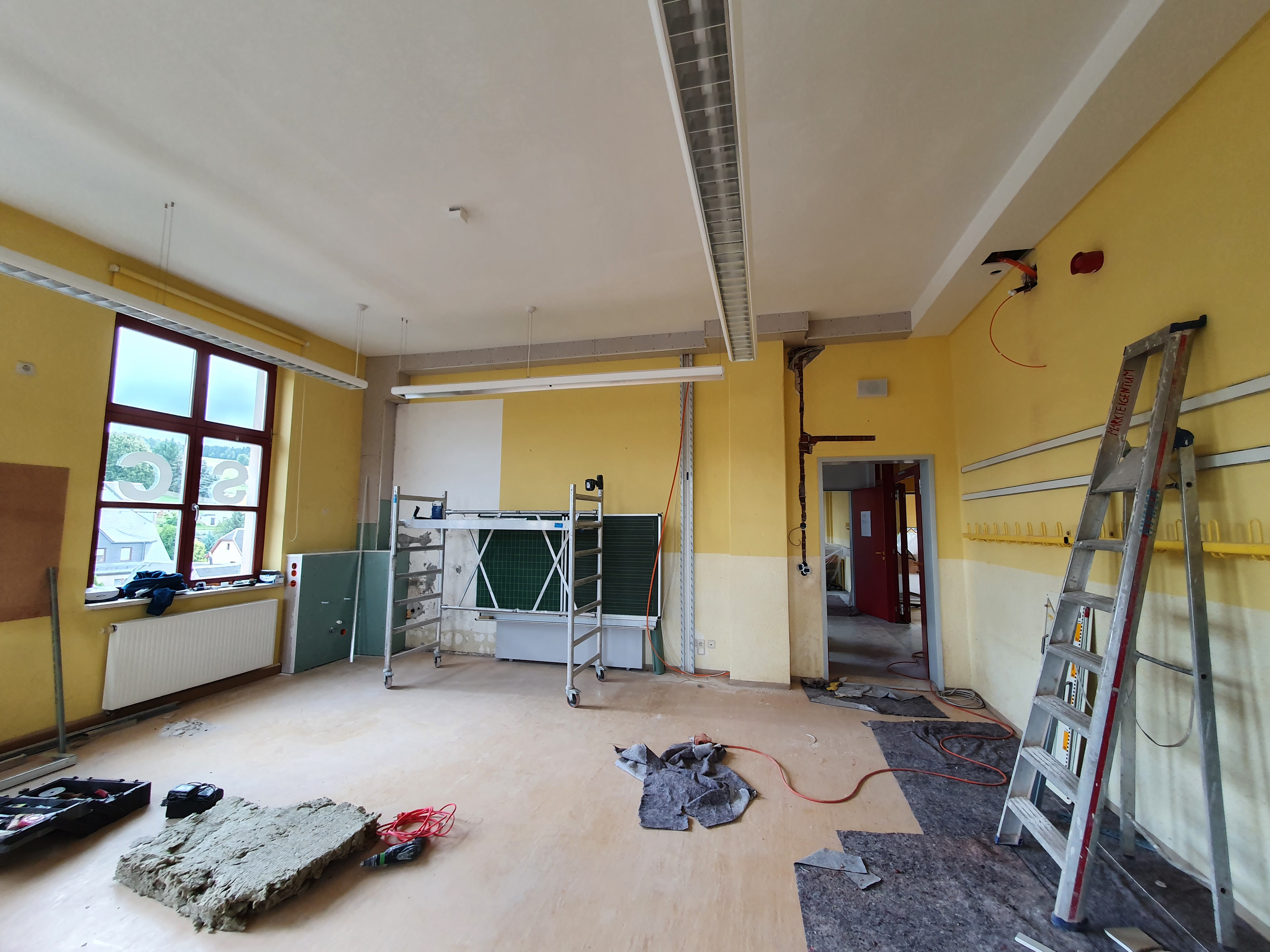 Bereits vor Beginn der Sommerferien wurde mit Abbrucharbeiten im Objekt begonnen. Die alten, aus DDR-Zeiten verbauten und überdimensionierten, Trinkwasserleitungen wurden durch neue Leitungen ersetz. Aufgrund von Brandschutzanforderungen war es sehr aufwändig fachgerechte Wand- und Deckenschotte herzustellen. Parallel zu den Arbeiten an den Trinkwasserleitungen erfolgten Arbeiten im Rahmen des Digitalpaktes. Ca. 3km neue Datenleitungen wurden im Objekt verlegt. Es wurden die Voraussetzungen geschaffen zur Installation neuer digitaler Endgeräte wie, interaktive und digitale Schultafeln, mobile Endgeräte und WLAN-Access Points. Für die Arbeiten musste in jedes Klassenzimmer eingegriffen werden. Bis zum letzten Ferientag wurde im Schulgebäude Hand angelegt um einen Schulstart am darauffolgenden Montag zu gewährleisten. Wir möchten uns bei allen beauftragten Firmen (Baugeschäft Georgi, Elektro Peter, HTW Wildbach, Tip-Top Gebäudereinigung, Fußbodenleger Friedrich, Malerbetrieb Stöckner) und Planungsbüros (IB Burchhardt, IB Voigt, IfEP Leonhardt) bedanken, die wirklich bis zum Schluss ihr Bestes gegeben haben um das Vorhaben gelingen zu lassen. Ebenfalls gilt unser Dank der Lehrerschaft, welche in der letzten Ferienwoche mehr mit Aufräumen und Säubern der Unterrichtsräume beschäftigt waren als mit der eigentlichen Schulvorbereitung.