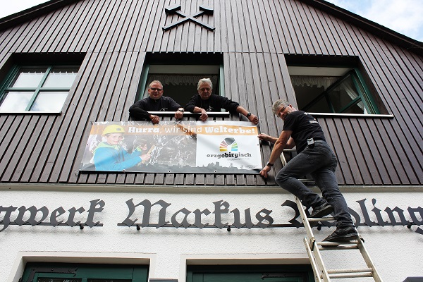 Die Freude im Erzgebirge ist groß ob der Ernennung der Montanregion Erzgebirge/Krušnohoří zum Welterbe. So groß, dass in den ersten Minuten nach der spannenden Entscheidung in Baku, 14:40 Uhr Ortszeit Erzgebirge, bereits an ersten Objekten der insgesamt 22 Bestandteile die neuen Flaggen „Hurra wir sind Welterbe“ wehten.