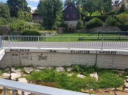 Die Tinte auf dem Abnahmeprotokoll zur Hochwassermaßnahme an der Dr.-Otto-Nuschke-Straße ist noch nicht ganz trocken und schon waren Schmierfinken am Werk um die Brückenplatte sowie Teile der Bachmauer zu beschmieren.