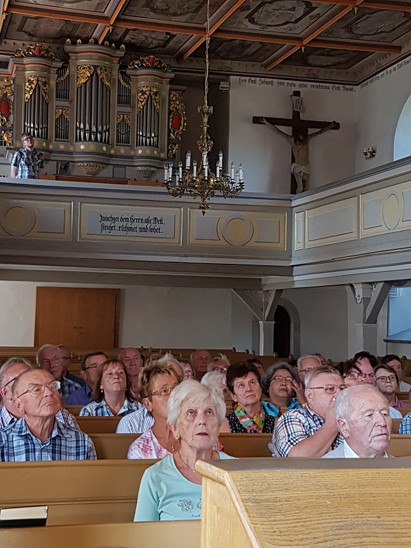 In Zschorlau angekommen besuchten wir zunächst die ev.-luth. Kirche. Pfarrerin Katrin Seifert erläuterte die Geschichte der Kirche, erzählte von der Restaurierung der Bilderdecke und beantwortete gern die Fragen unserer Gäste. Kantor Andreas Conrad erklärte die Geschichte der Orgel und spielte natürlich mehrere Stücke. Die Reisegruppe aus Dietenhofen war von dem Aufenthalt in der Kirche sehr angetan. Künftige weitere gegenseitige Besuche wie beispielsweise zwischen den Kirchgemeinden wurden angeregt. Unser Bürgermeister lud zudem zu einem Besuch der Zschorlauer Passionsspiele im Jahr 2020 ein.